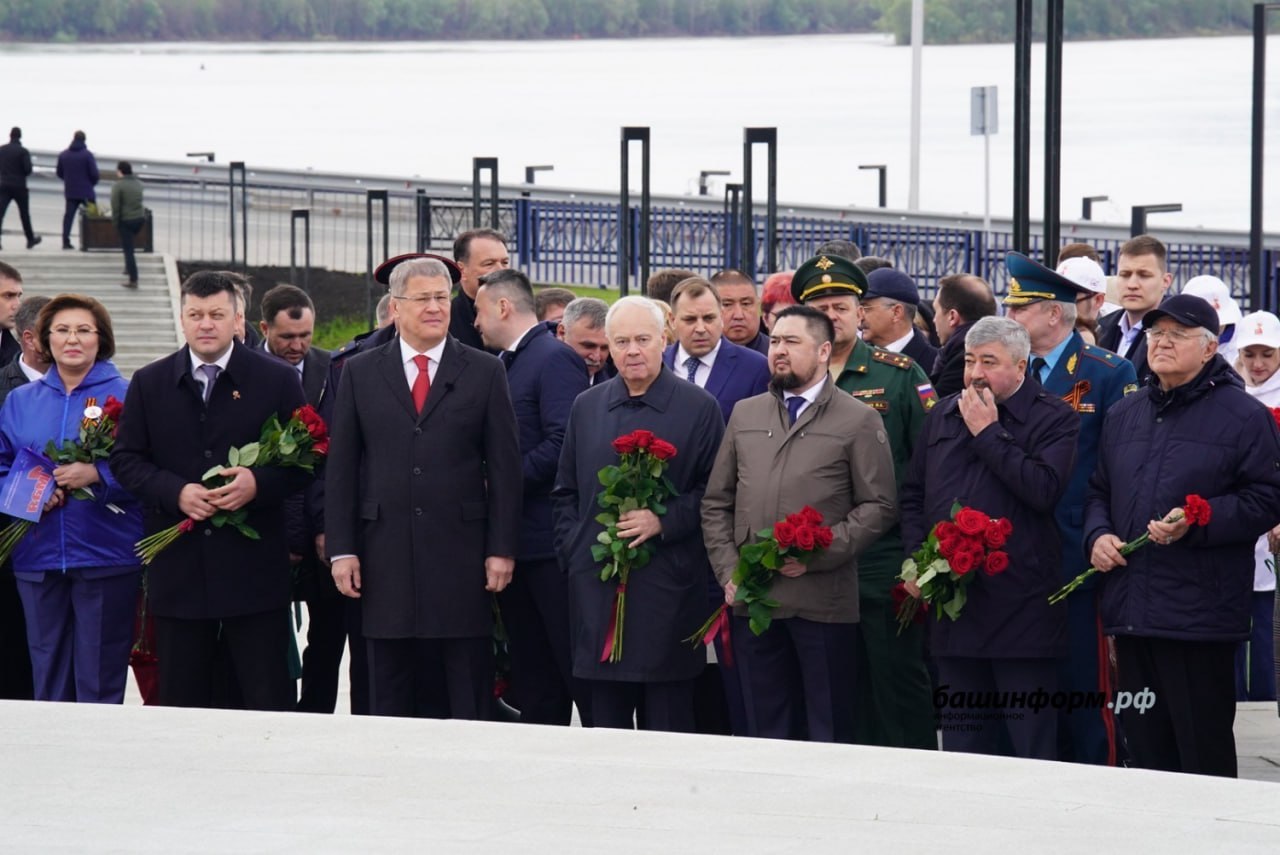 Радий Хабиров, Ратмир Мавлиев м Константин Толкачев возложили цветы к стеле «Уфа — город трудовой доблести»