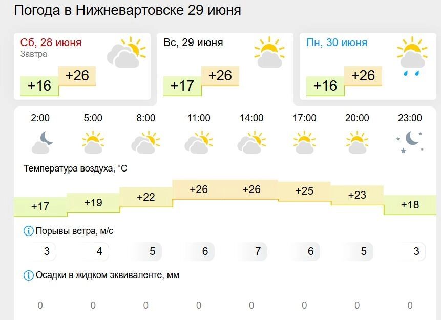 Вечером в Нижневартовске жара не спадет. К 17 часам ожидается +25 градусов, к вечеру прогнозируют +23 градуса. Ветер при этом замедлится и составит 3 м/с.