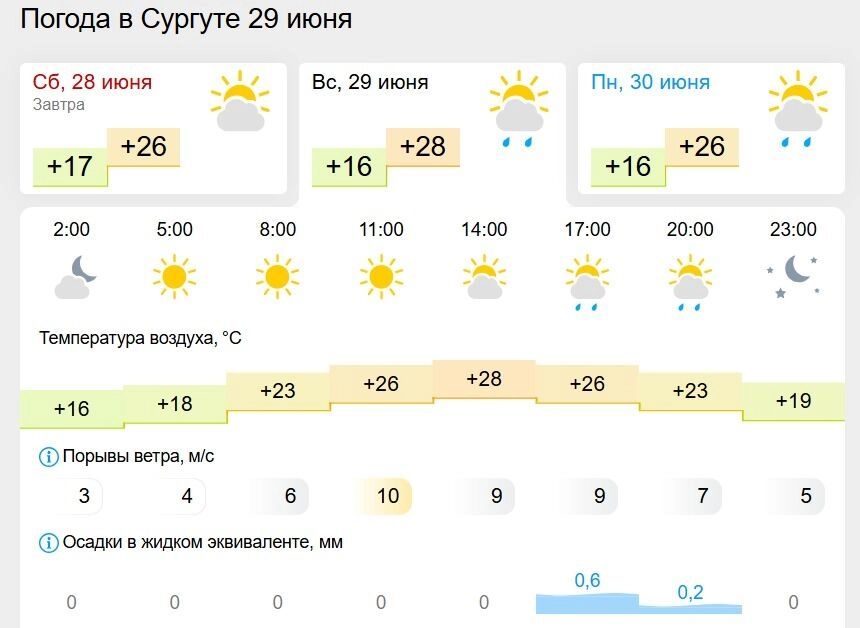 В Сургуте температура воздуха начнет прогреваться с 5 часов утра. Синоптики передают +18 градусов. К 11 часам столбик термометра поднимется до +26 градусов, а к 14 часам — до +28 градусов. Скорость ветра усилится и составит 10 м/c.