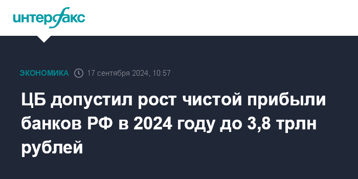 Москва. 17 сентября. INTERFAX.RU - ЦБ РФ повысил прогноз по чистой прибыли банков на 2024 год до 3,3-3,8 трлн рублей с прежних ожиданий в 3,1-3,6 трлн рублей, говорится в ежеквартальном обзоре регулятора.