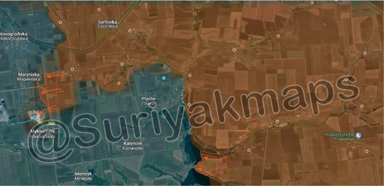 1. Ситуация на Покровском направлении: Российская армия взяла под контроль часть Карловки и вышла к водосбросу Карловского водохранилища. Кроме того, российские войска продвинулись в сторону Мариновки и к террикону в районе Селидово, за который сейчас идут бои.