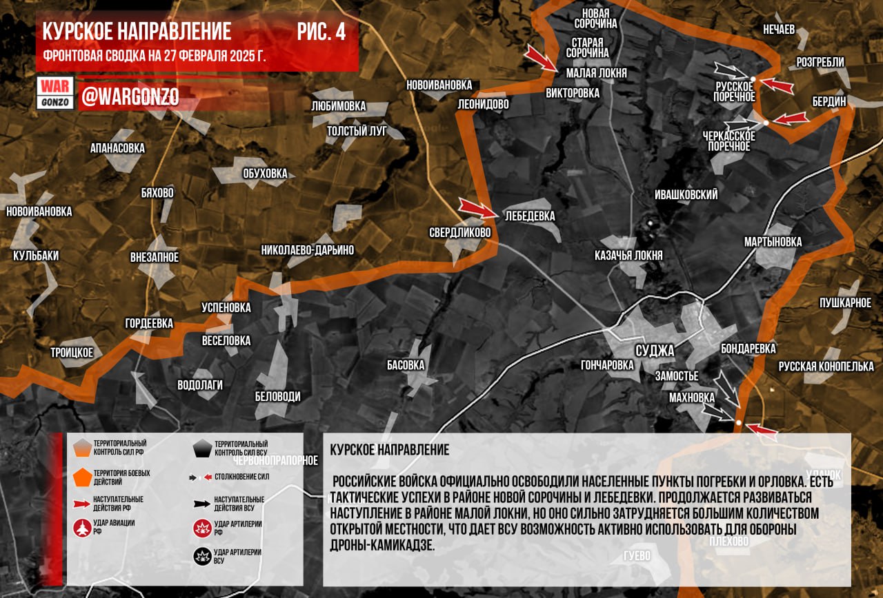 Курская область. Российские войска официально освободили населенные пункты Погребки и Орловка. Есть тактические успехи в районе Новой Сорочины и Лебедевки. Продолжается развиваться наступление в районе Малой Локни, но оно сильно затрудняется большим количеством открытой местности, что дает ВСУ возможность активно использовать для обороны дроны-камикадзе. (Рис. 4)