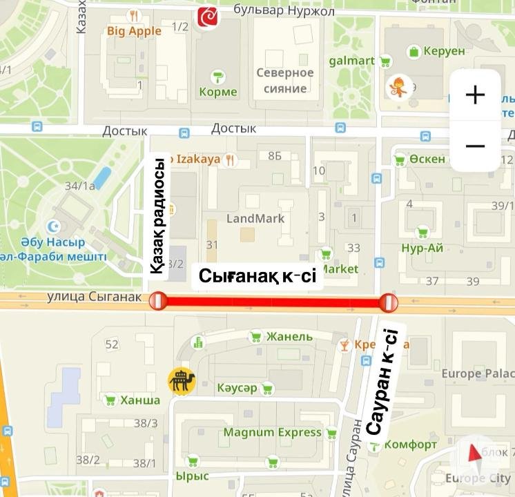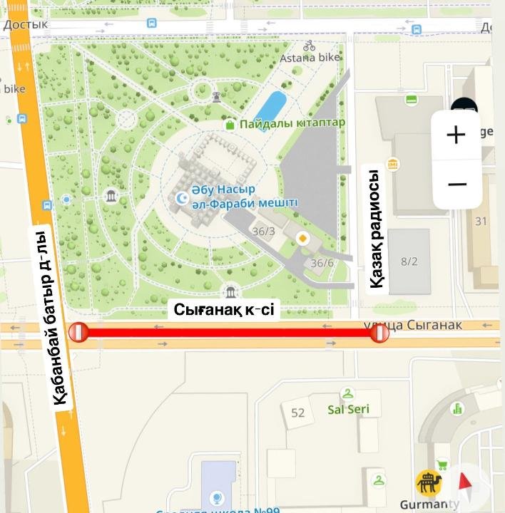 В связи с этим до 25 июля будет полностью закрыто движение на участках от проспекта Кабанбай батыра до Қазақ радиосы и от Қазақ радиосы до улицы Сауран.