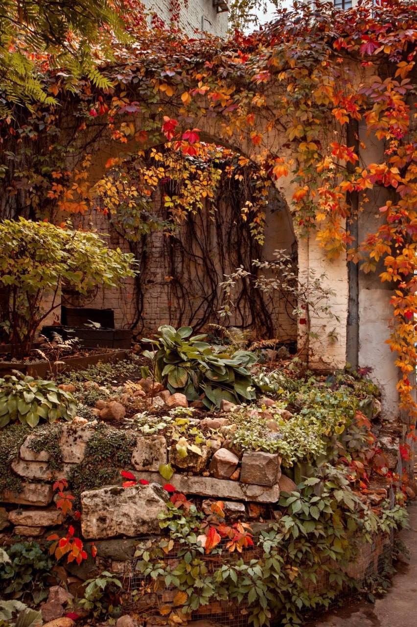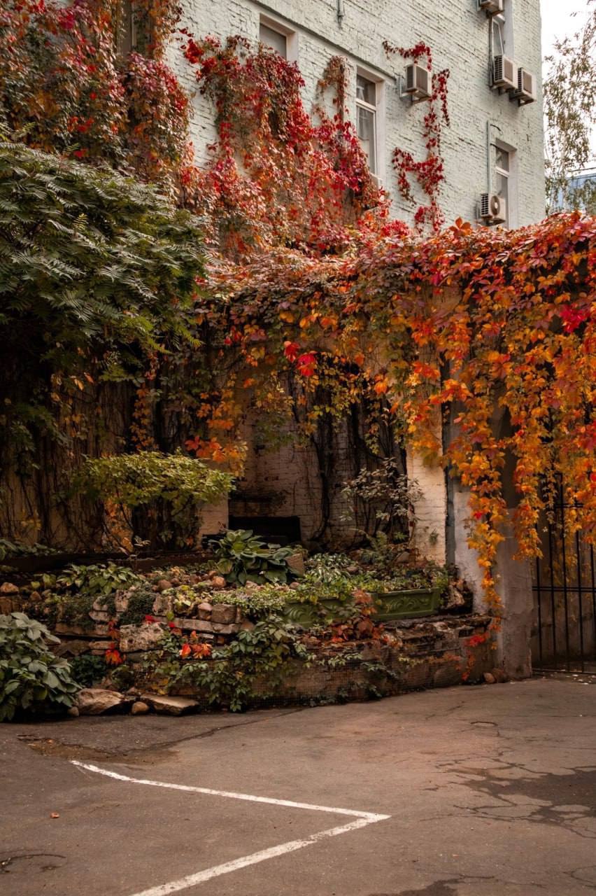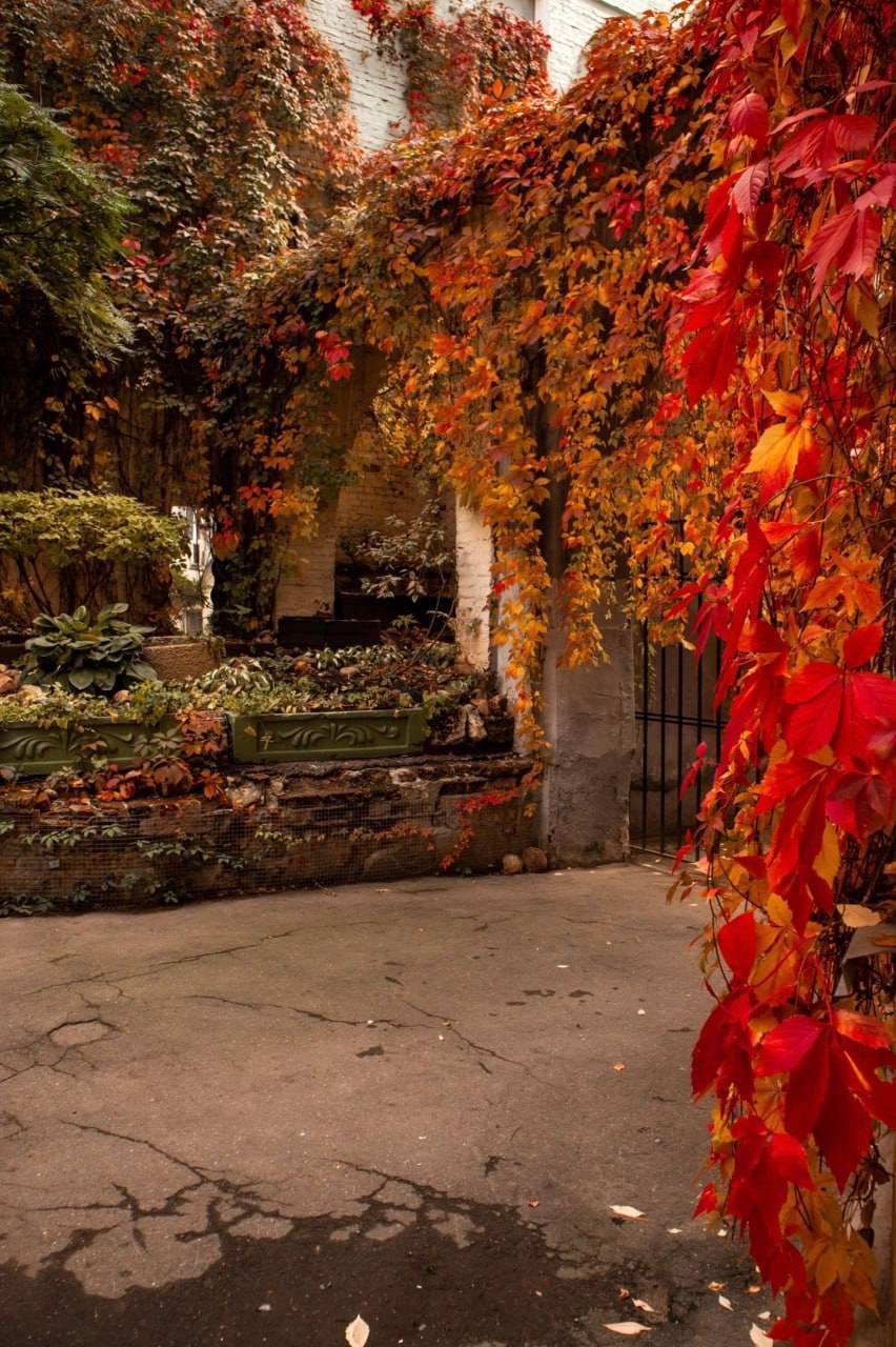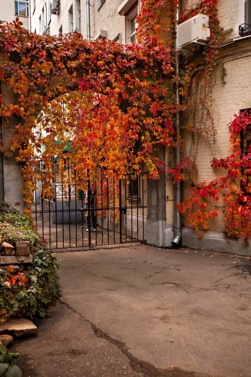 В самом сердце города спрятан маленький дворик, который полностью погружён в атмосферу осени. Стены домов окутаны золотыми и багряными листьями.