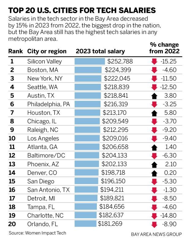 Зарплаты в технологическом секторе США сильнее всего упали в Кремниевой долине, хотя и остаются самыми высокими
