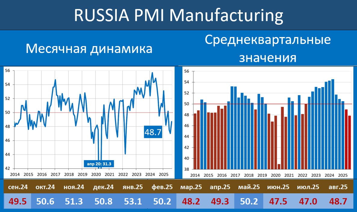 Индекс Russia PMI mfg, характеризующий конъюнктуру в обрабатывающей промышленности несколько сократил предыдущее падение и составил в августе 47.0 пунктов vs 48.7 в июле.