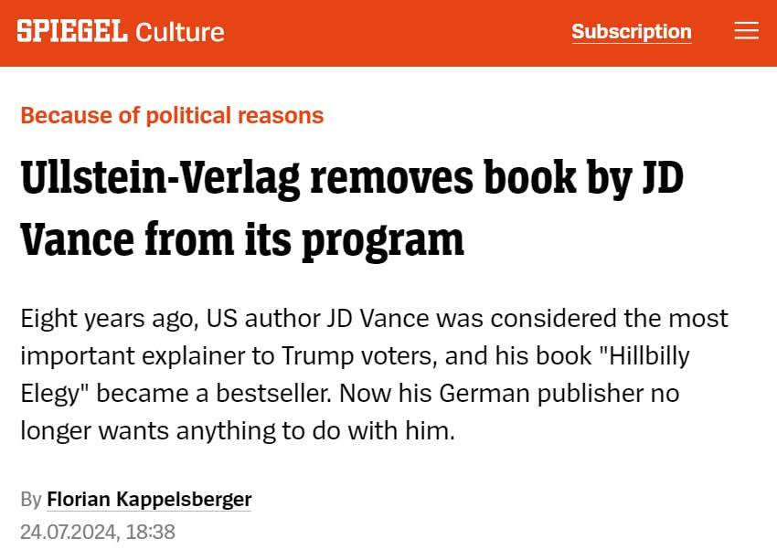 В Германии снимают с продаж книгу будущего вице-президента США Трампа Венса - "Элегия хиллбилли".