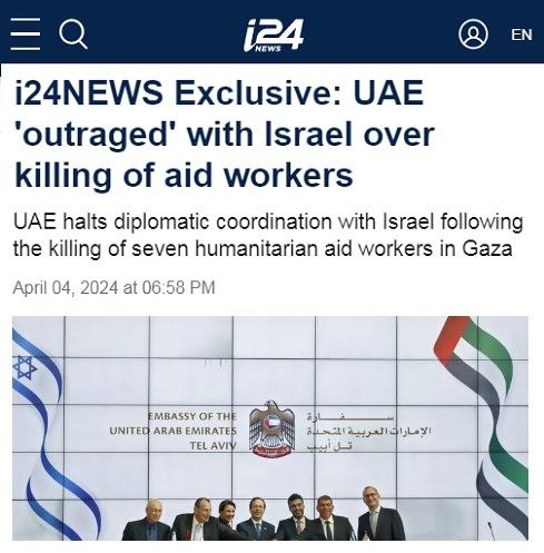 Объединенные Арабские Эмираты прерывают дипломатические отношения с Израилем после убийства 7 волонтеров World Central Kitchen, доставлявших в Газу гуманитарную помощь.