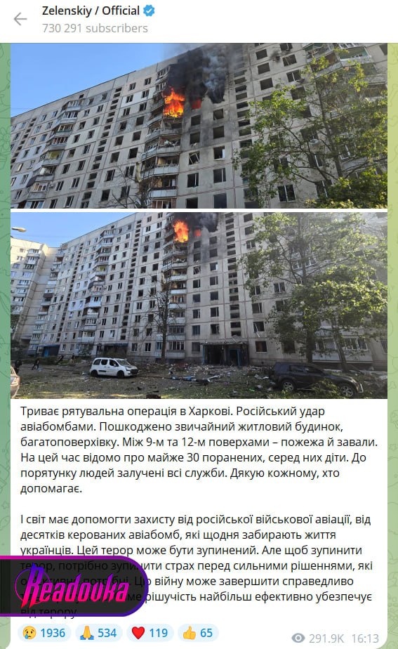 На Украине заявили, якобы русская авиабомба ударила по жилой многоэтажке в Харькове — это очередная ложь, прикрывающая кривую работу ПВО незалежной. Развенчать ее можно, посмотрев на кадры с места. Во-первых, при применении даже наших самых «маленьких» ФАБ-250, как показывают данные объективного контроля, боеприпас наносит существенно больший урон. В случае же с харьковской многоэтажкой видны относительно небольшие повреждения — их получили лишь 4 верхних этажа. Ущерб на видео с места характерен для зенитных ракет, которым не требуется огромный заряд в тротиловом эквиваленте, чтобы поразить воздушную цель.
