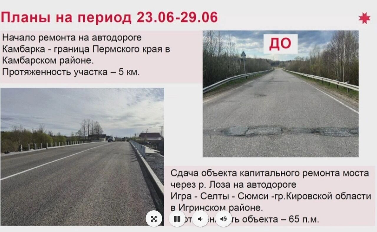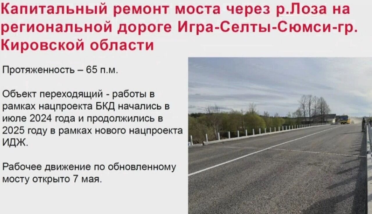 На этой неделе дорожники планируют сдать в эксплуатацию новый мост через реку Лоза на региональной трассе Игра — Селты — Сюмси — граница Кировской области. Работы на нем начались в 2024 году, рабочее движение открыли 7 мая. В планах на эту неделю также ремонт дороги Камбарка — граница Пермского края в Камбарском районе, подытожил министр транспорта и дорожного хозяйства Удмуртии.