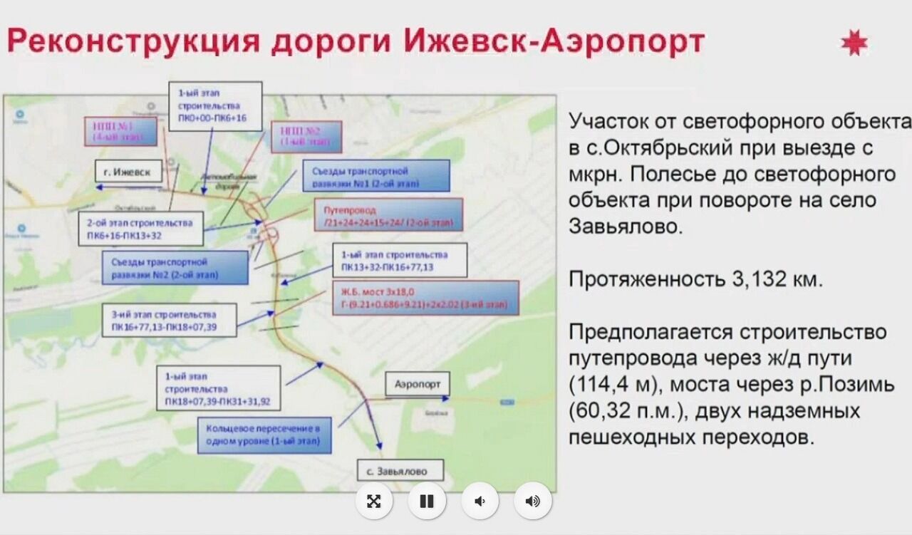 Министр подробно остановился на планах реконструкции дороги Ижевск — Аэропорт. Как мы недавно сообщали, власти региона уже объявили конкурс среди подрядчиков. Полная стоимость контракта — около 4,7 млрд рублей, проект трехлетний, финансирование будет выделяться частями.