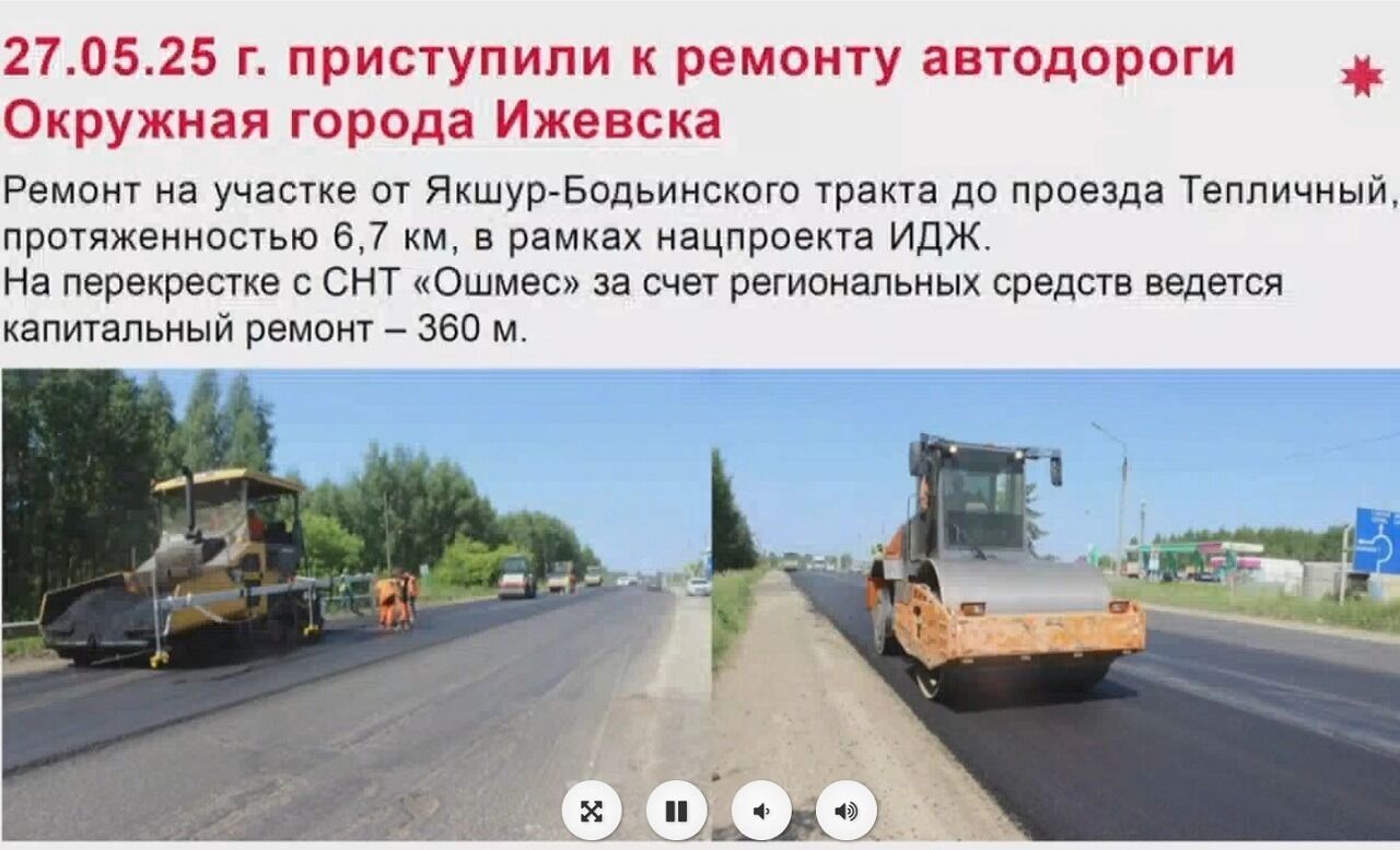 Кроме того, 27 мая дорожники приступили к ремонту Окружной дороги Ижевска, участок протяженностью 6,7 км с капремонтом отрезка в 360 метров на перекрестке с СНТ «Ошмес». Там обустроят остановочные павильоны, безопасный выезд и съезд.
