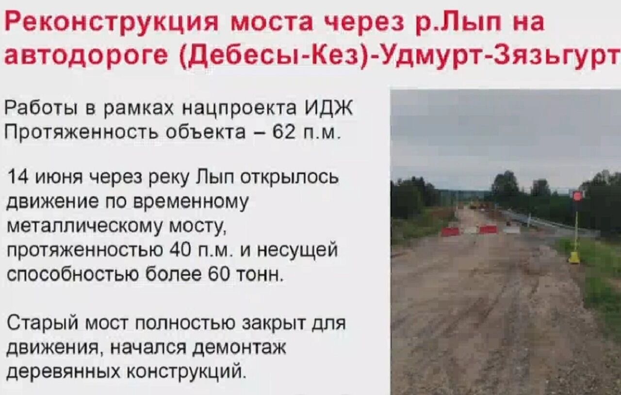 «Также начато уже движение по обновленному мосту через реку Шихостанку в Киясовском районе, открылось рабочее движение транспорта, мост новый, однопролетный. Грузоподъемность всех конструкций сейчас порядка 100 тонн», — добавил Геннадий Таранов.