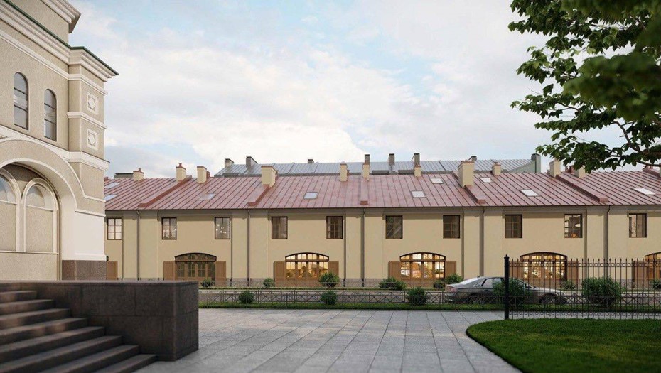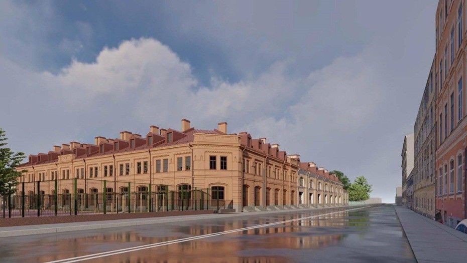 Современные постройки с наклонными крышами возведут за малоэтажными корпусами, а в концепции предусмотрено не только воссоздание утраченного корпуса по Старорусской улице, но и реставрация сохранившегося корпуса Мытного двора по проспекту Бакунина.