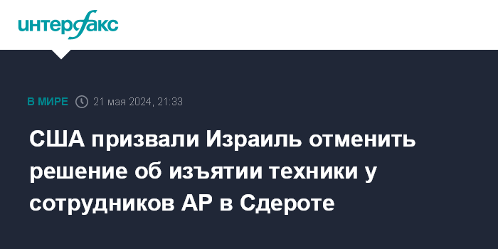 Москва. 21 мая. INTERFAX.RU - Администрация президента США Джо Байдена во вторник обратилась с просьбой к израильским властям отменить решение о конфискации оборудования у сотрудников Associated Press (AP) на юге Израиля, сообщает Axios со ссылкой на источники.