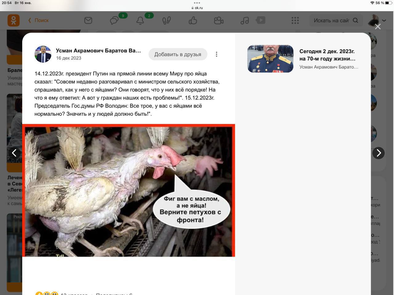 Прошу Вас принять меры в отношении гражданина России, главы узбекского землячества, усмана баратова, который на своей официальной странице в «одноклассниках» 29 декабря 2023 года обозвал русских военных петухами!