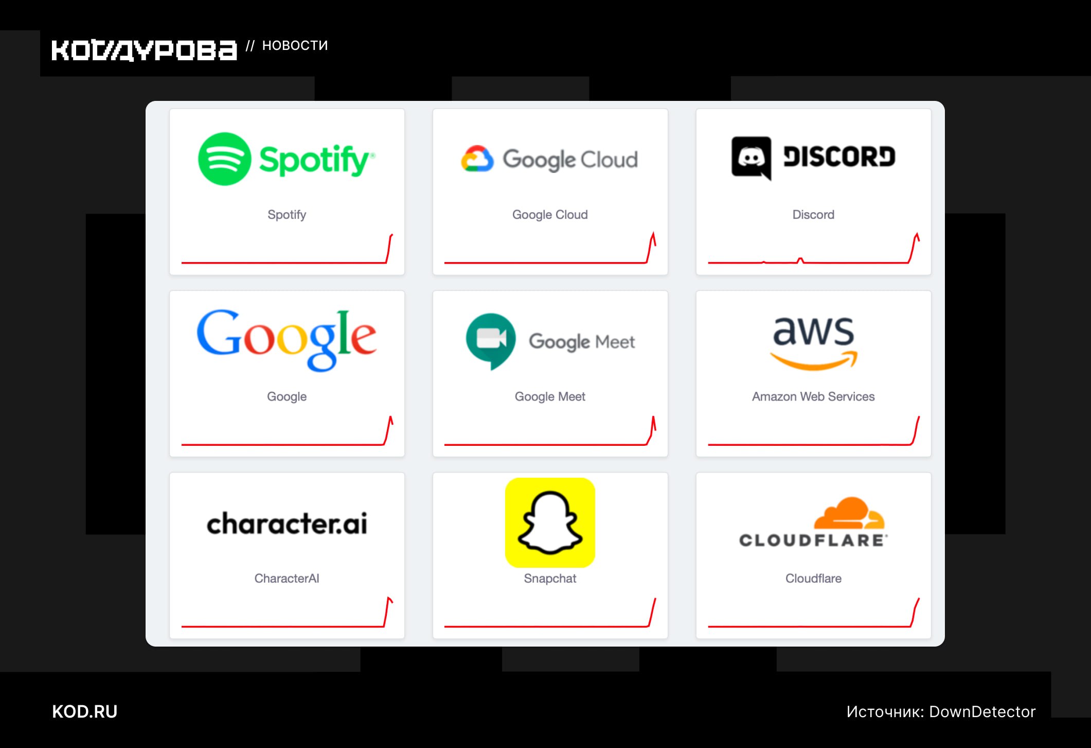 💘 Причина заключается в сбоях у трёх ключевых хостинг-провайдеров: CloudFlare, Google Cloud и Amazon Web Services. Первые две компании подтвердили неполадки.