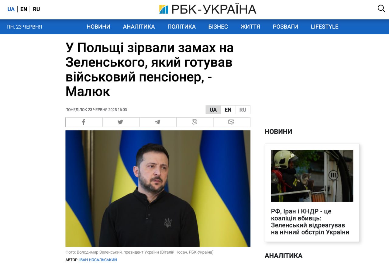 «С нашей стороны это была очень сложная работа. Мы занимались этим почти два года, по сути — с начала войны. Совершили мощное агентурно-техническое проникновение в эту группу. Кроме покушения на президента, они собирали информацию, передавали её. В том числе готовили покушение на моего коллегу Кирилла Алексеевича Буданова и на меня лично», — подчеркнул Малюк 🤡.