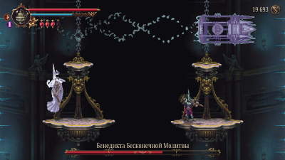 Впрочем, по мере прокачки арсенала каждый образец становится универсальным. Последнюю треть в битвах я почти не расставался с зазубренным клинком. Но оружие используется не только в драках. Оно же служит инструментом для преодоления определенных препятствий. Кистень вызывает звуковую волну от колоколов, от которой ртутные капли на время превращаются в твердые платформы, а шпага позволяет телепортироваться между зеркалами.