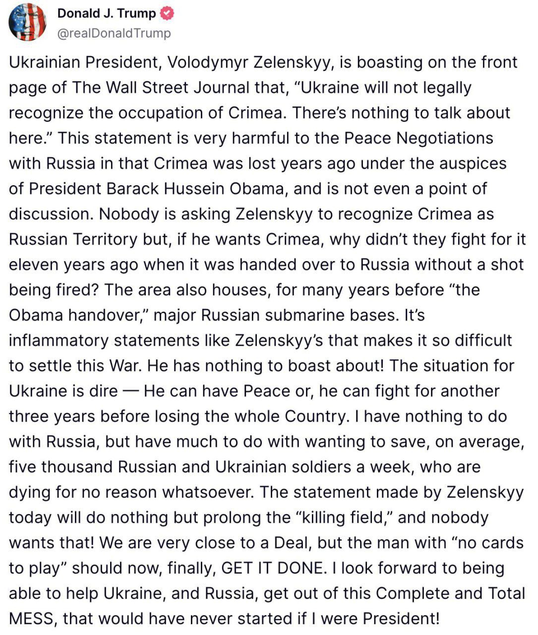 Ситуация на Украине плачевна. Зеленский должен заключить мир, либо он потеряет всю страну "уже через несколько лет", заявил Трамп.