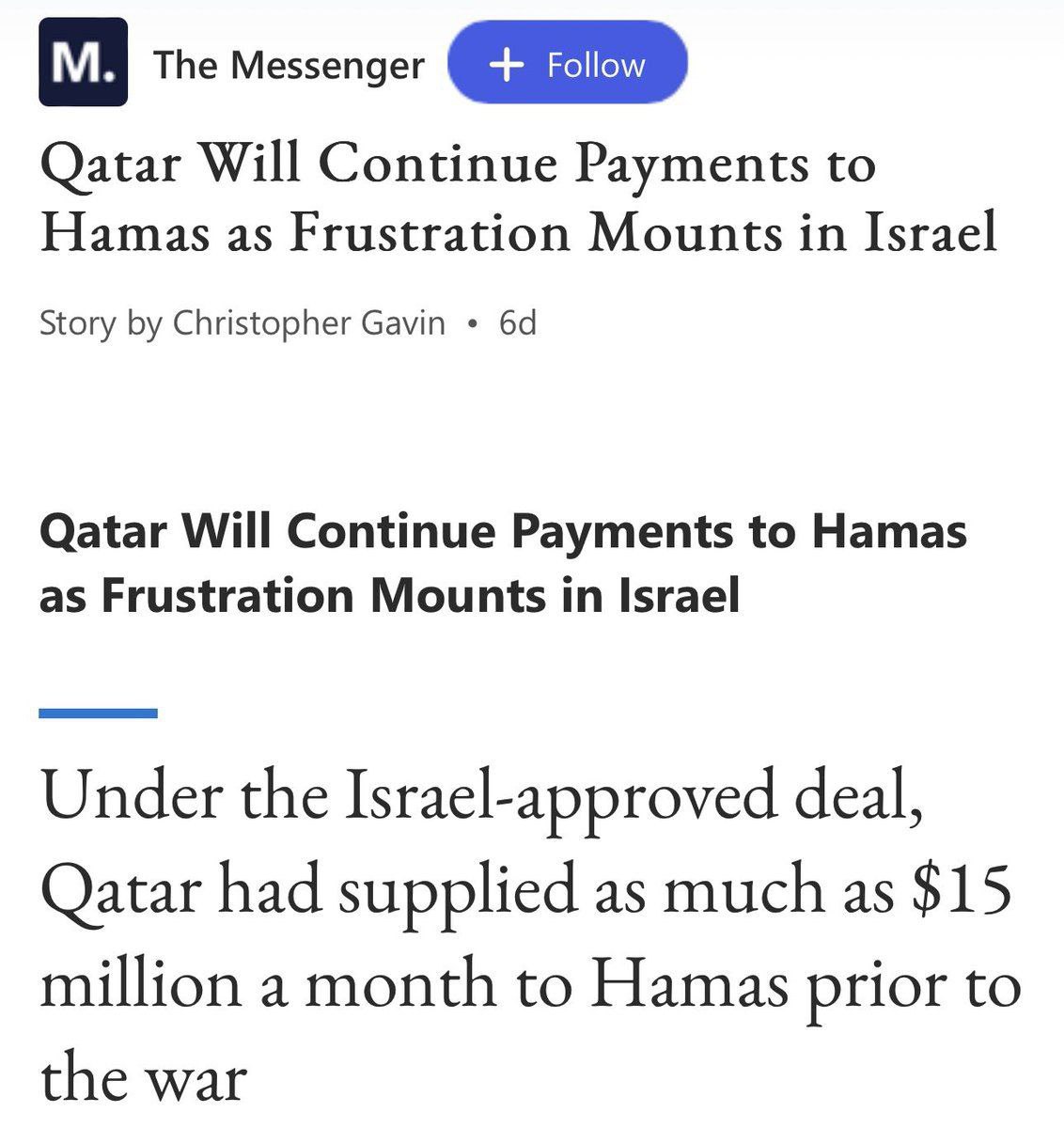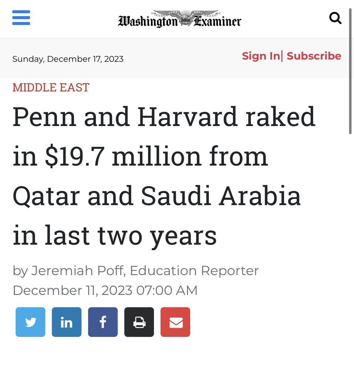 Тут расследование в США опубликовали о том, как Катар финансировал Университет Пенсильвании и Гарвард миллионами долларов. Катар поддерживает ХАМАС и хочет превратить университеты США в приюты для джихадистов.