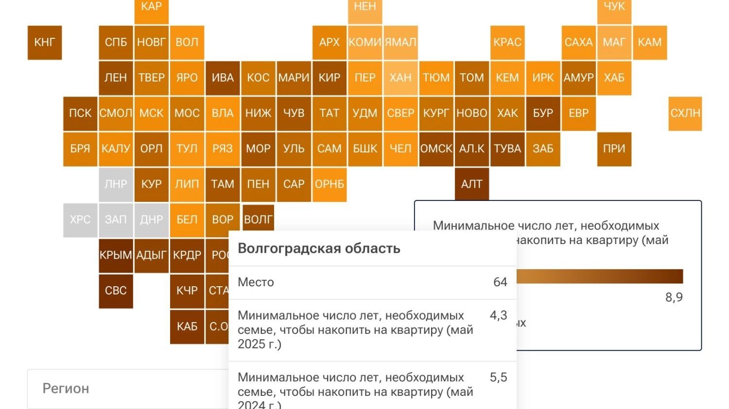 В рейтинге наш регион занял 64-е место. Копить семьям придется 4,3 года, по данным на май текущего года. Для сравнения, в минувшем году им потребовалось бы 5,5 лет.