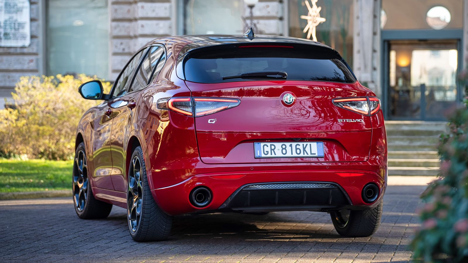 На кадре виден элемент, созданный из непрерывающейся светодиодной линии. Он выполнен в форме вытянутого «щита» Scudetto, который является неотъемлемой частью фамильного дизайна передней части (его форму имеют решётки радиатора моделей Alfa Romeo). Отметим, у актуального Stelvio задние фонари тоже украшены треугольниками со скруглёнными углами, но новый элемент, судя по всему, раскинется на всю ширину багажной двери.