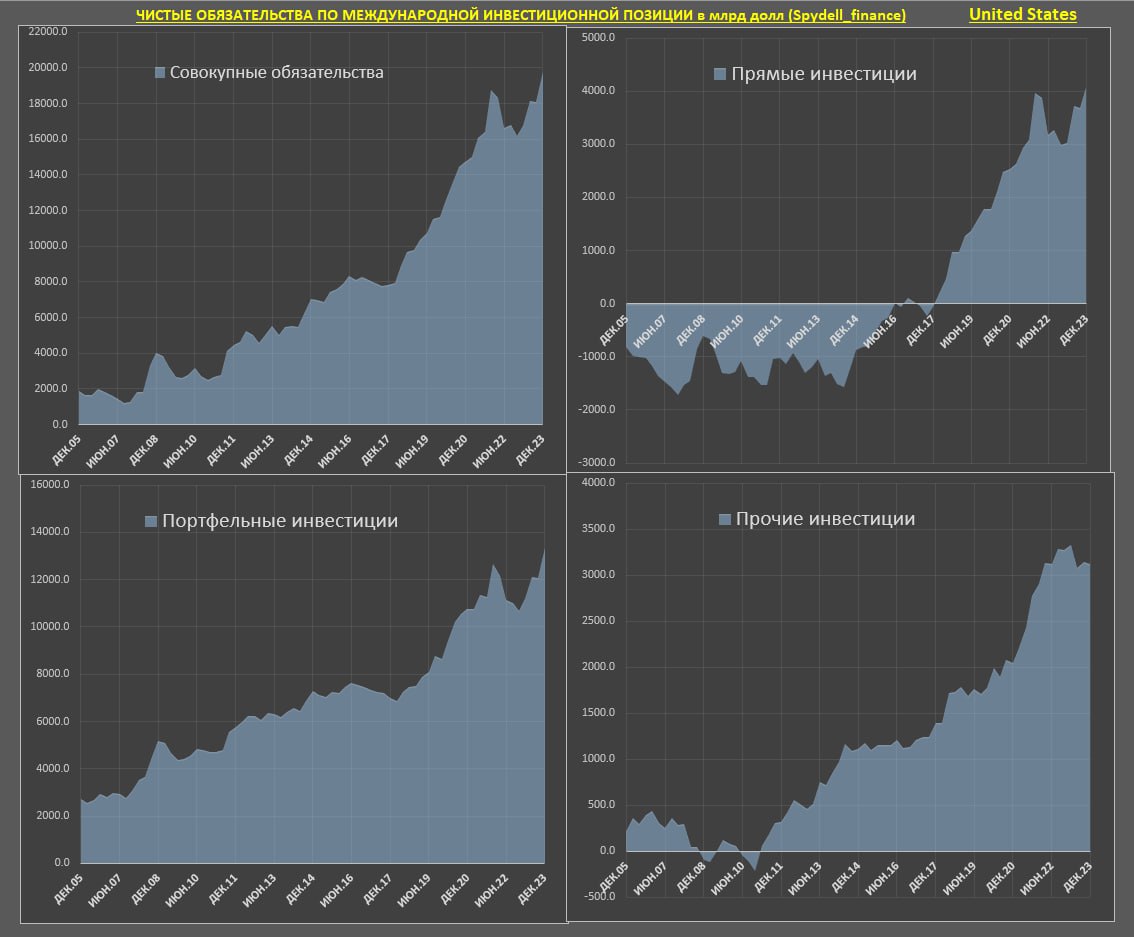 Когда-то в США был отрицательный баланс международной инвестиционной позиции всего на 1.2 трлн (декабрь 2007), к началу 2024 отрицательный баланс вырос до 20 трлн!