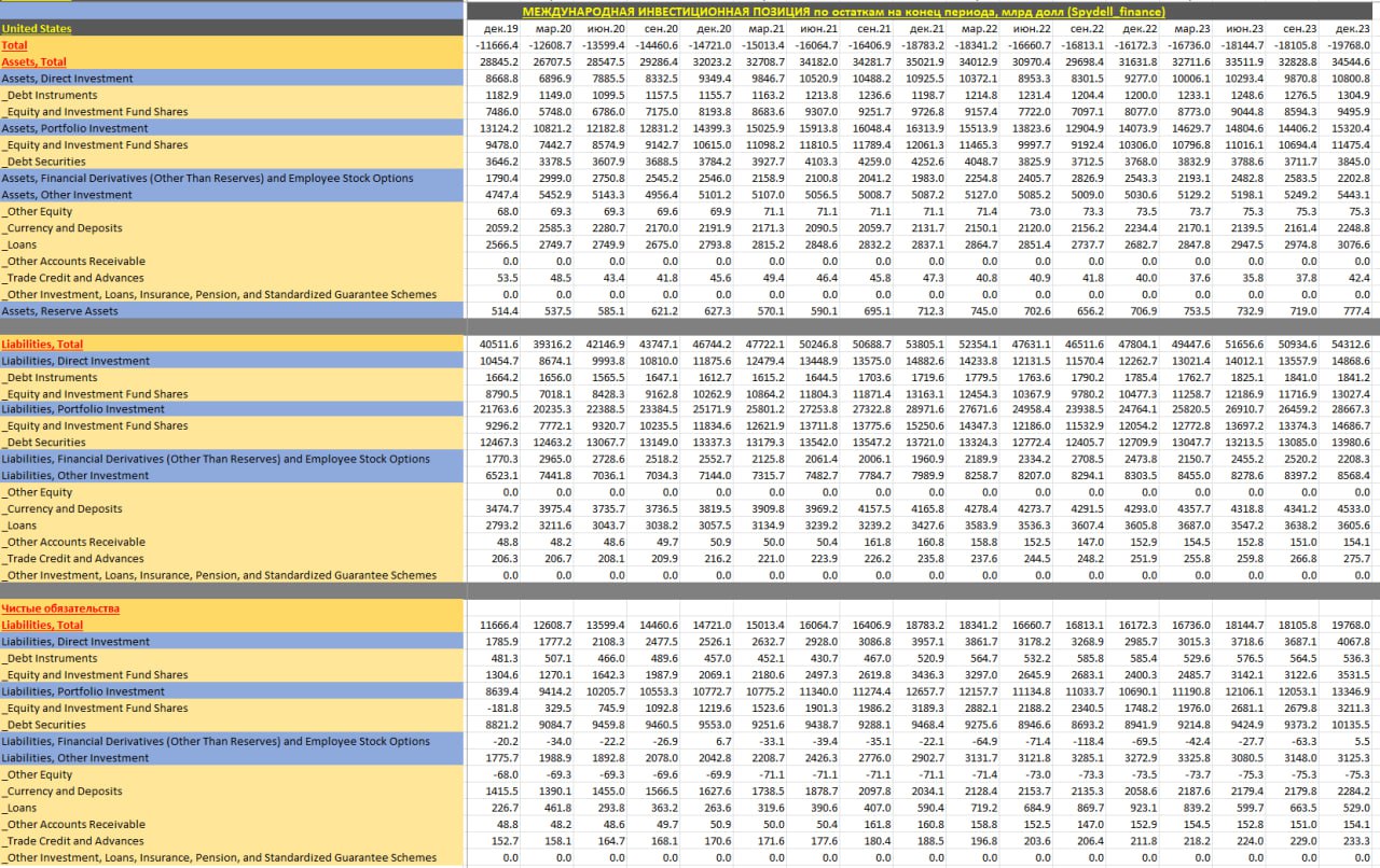 В 4кв23 США имели 34.5 трлн внешних активов при 54.3 трлн обязательств, среди которых прямых инвестиций – 10.8 трлн активов и 14.9 трлн обязательств, портфельных инвестиций – 15.3 трлн активов и 28.7 трлн обязательств, а прочих инвестиций – 5.4 трлн и 8.6 трлн обязательств.