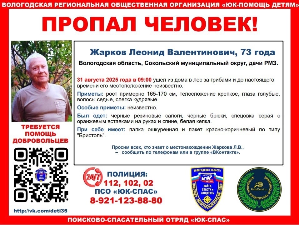 Приметы пропавшего: рост 165-170 сантиметров, крепкое телосложение, голубые глаза, седые волосы. Был одет в чёрные резиновые сапоги, чёрные брюки, серую спецовку с оранжевыми вставками и белую кепку. При себе имел палку и красно-коричневый пакет, – сообщает ГТРК «Вологда» со ссылкой на ПСО«ЮК-СПАС».