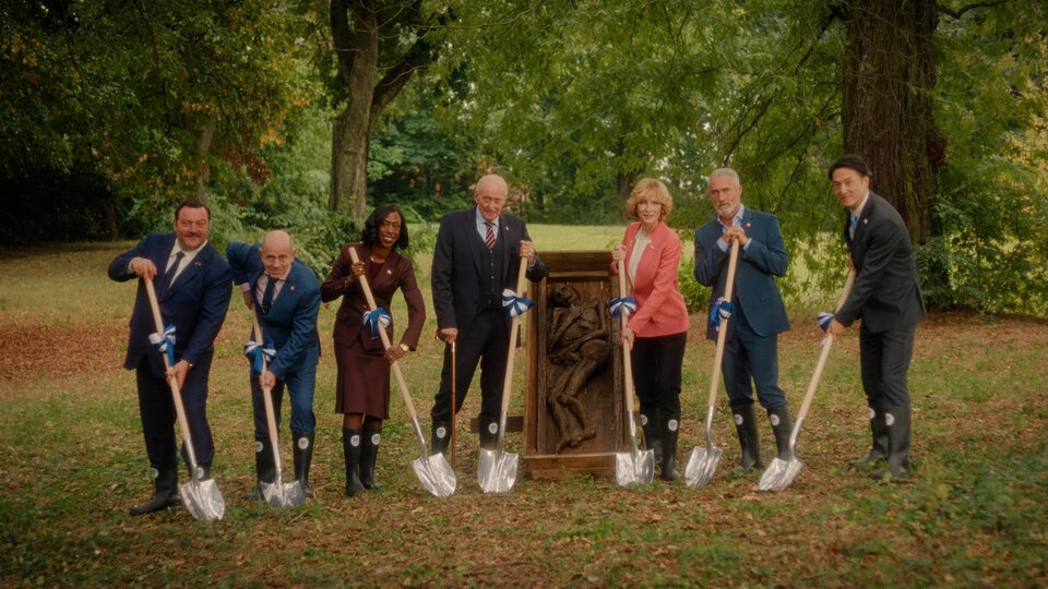 Весьма неожиданная глава в фильмографии канадского живого классика Гая Мэддина (и его регулярных в последнее время сорежиссеров братьев Джонсон): хоррор-комедия со звездами про саммит «Большой семерки». Лидеры свободного мира, собравшиеся в германском шато, вдруг обнаруживают, что наступил апокалипсис, и бродят по лесу, где агрессивно мастурбируют ожившие «болотные люди». Кейт Бланшетт в роли Ангелы Меркель, Алисия Викандер верхом на гигантском мозге, красивые туманы и миллион однотипных, но очень смешных шуток на национальной почве. Чистое счастье: «Не смотрите наверх» встречает ленинградский некрореализм.