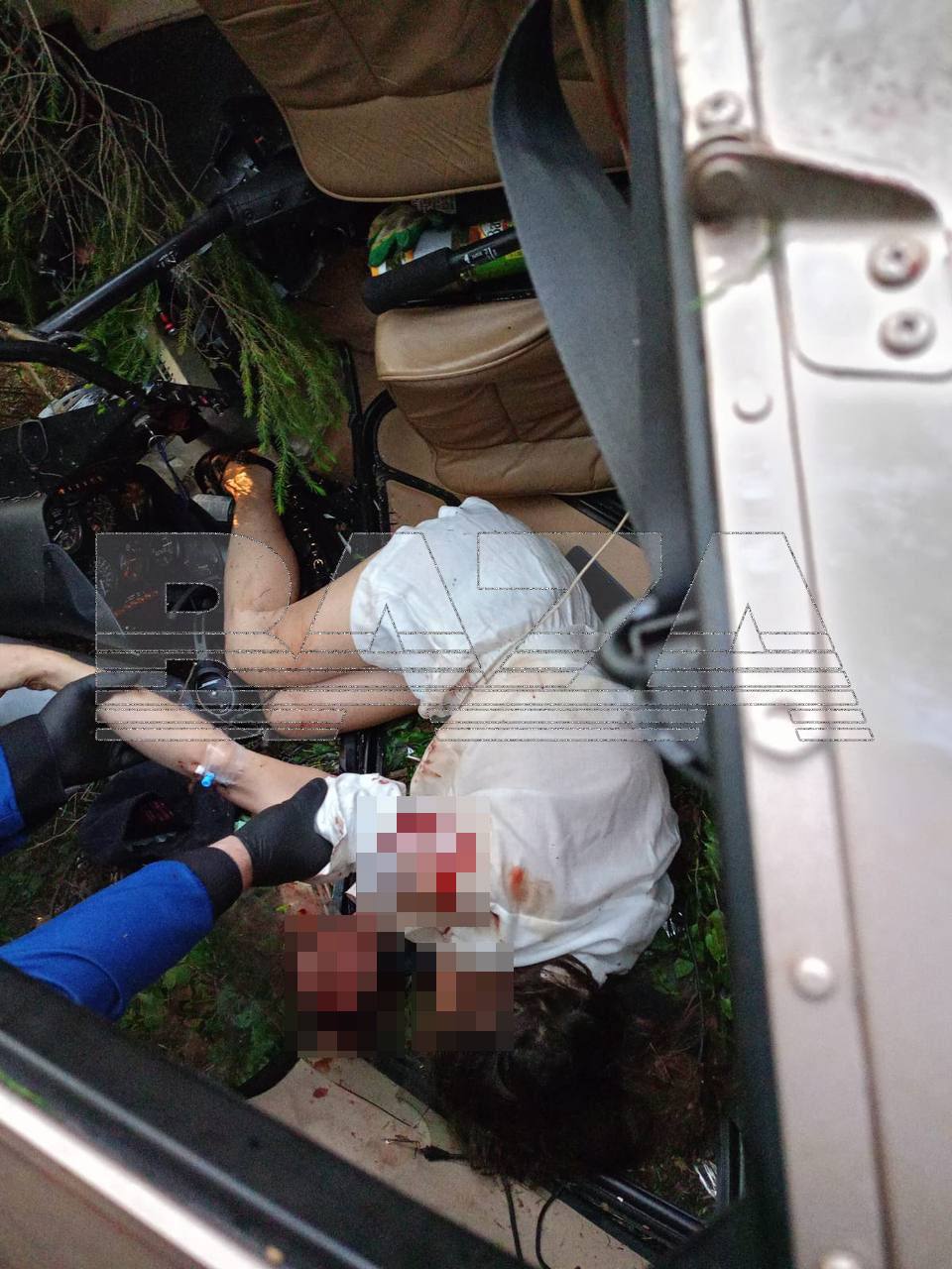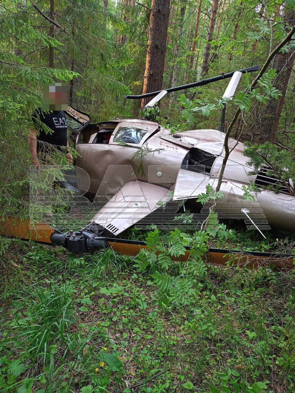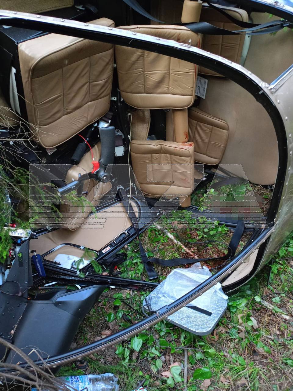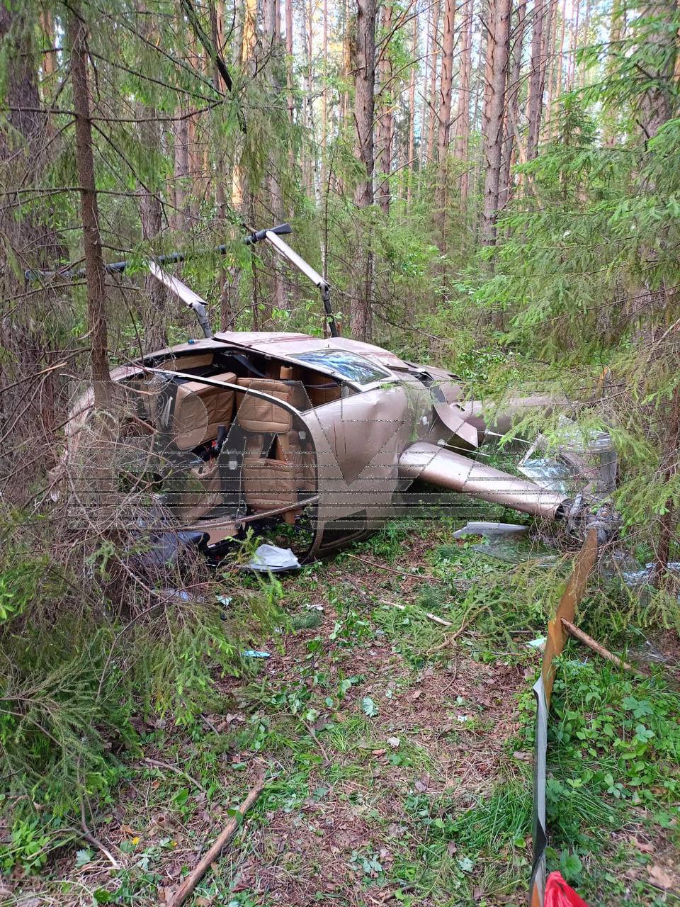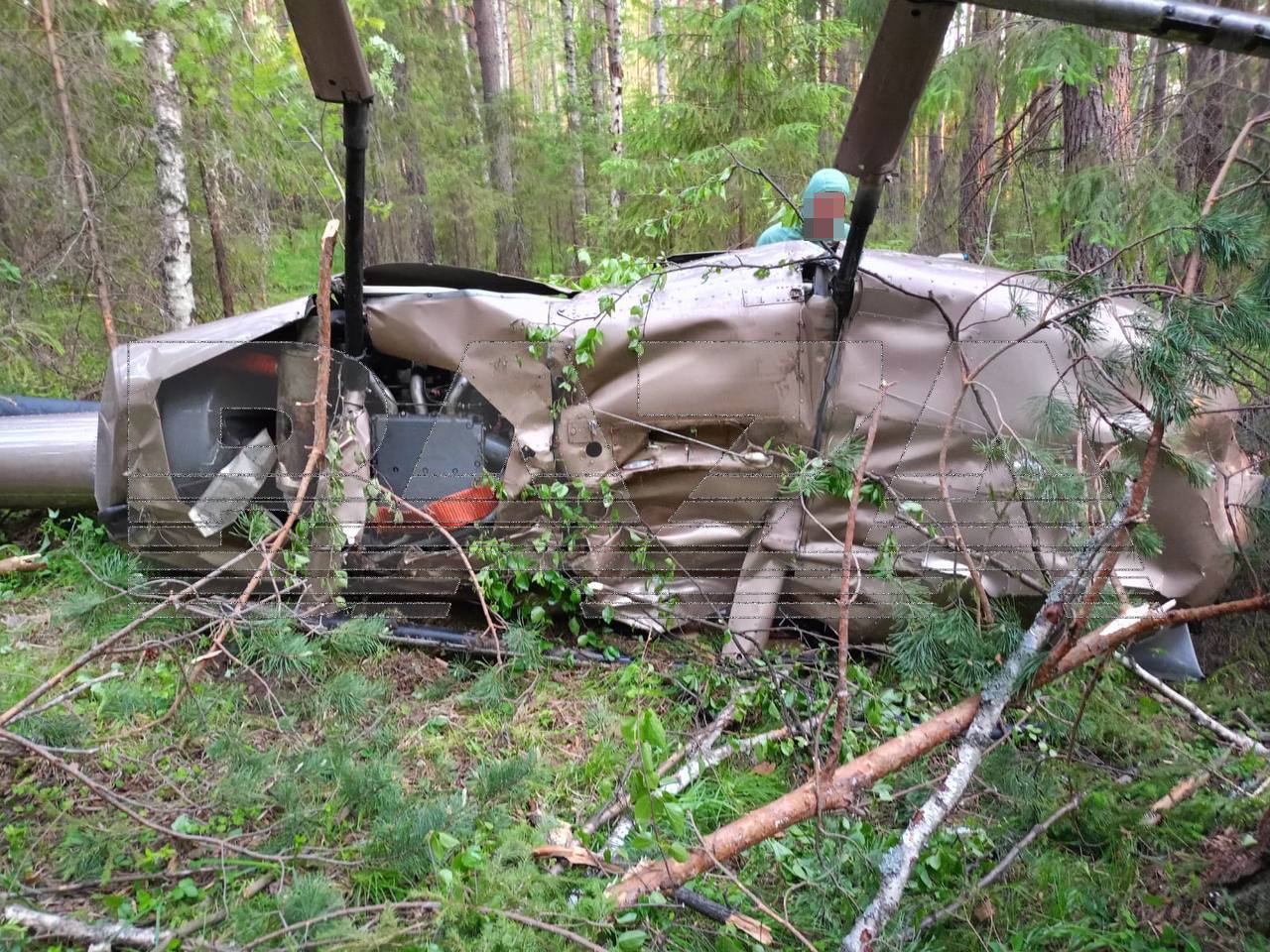Фото с места крушения вертолета в Свердловской области. Пострадали два человека: пилот и девушка-пассажир.