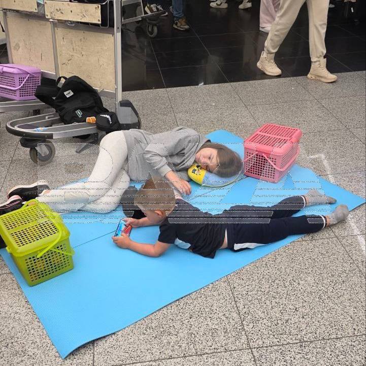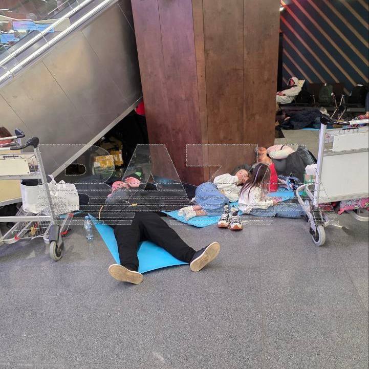 Под утро по терминалу спали дети и взрослые — на туристических ковриках, куртках и скамейках, кто-то устроился в магазинах. Табло с выдачей багажа застыло и не обновляется.