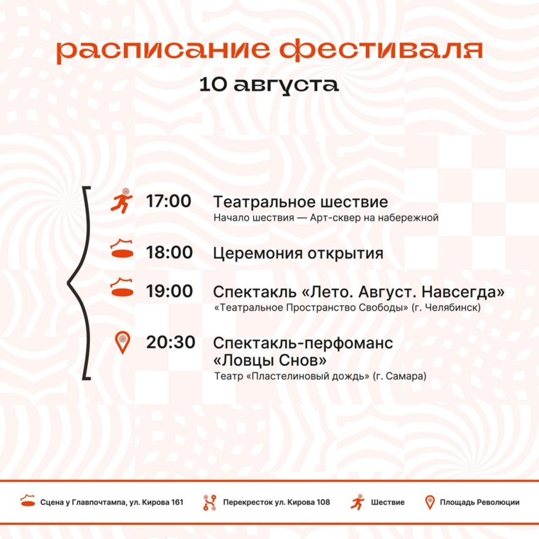 Фестиваль пройдет 10 августа с 17:00 часов и 11 августа с 11:00 часов. У него будут три площадки — Арт-сквер на набережной реки Миасс, пешеходная часть улицы Кирова и площадь Революции. Вход свободный.