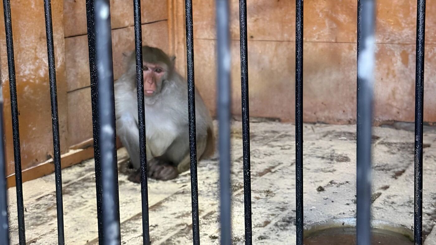 - Одинокая обезьяна-макака находится в антисанитарных условиях, покрытая насекомыми;
