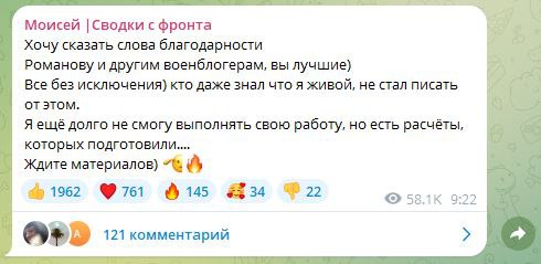 ▪️Сам Моисей был ранен и было решено провести операцию по дезинформации врага, на его странице появилось сообщение от имени жены о гибели супруга, в это время группа Моисея продолжала спокойно вести свою работу (когда-то позже расскажем об этом подробнее).