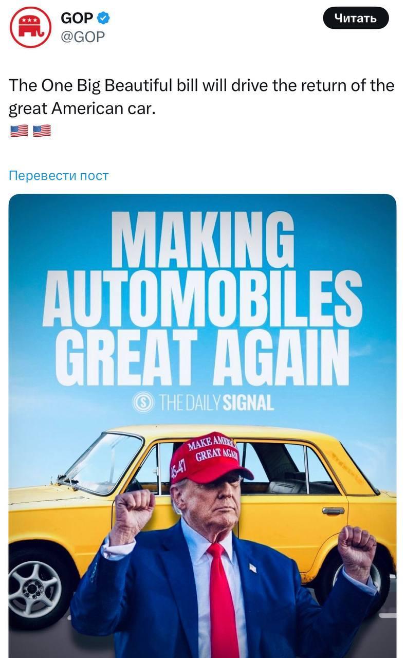 Партия опубликовала в соцсетях снимок, на котором президент Трамп танцует на фоне желтого детища советского автопрома. В комментариях, разумеется, сразу заметили ошибку.