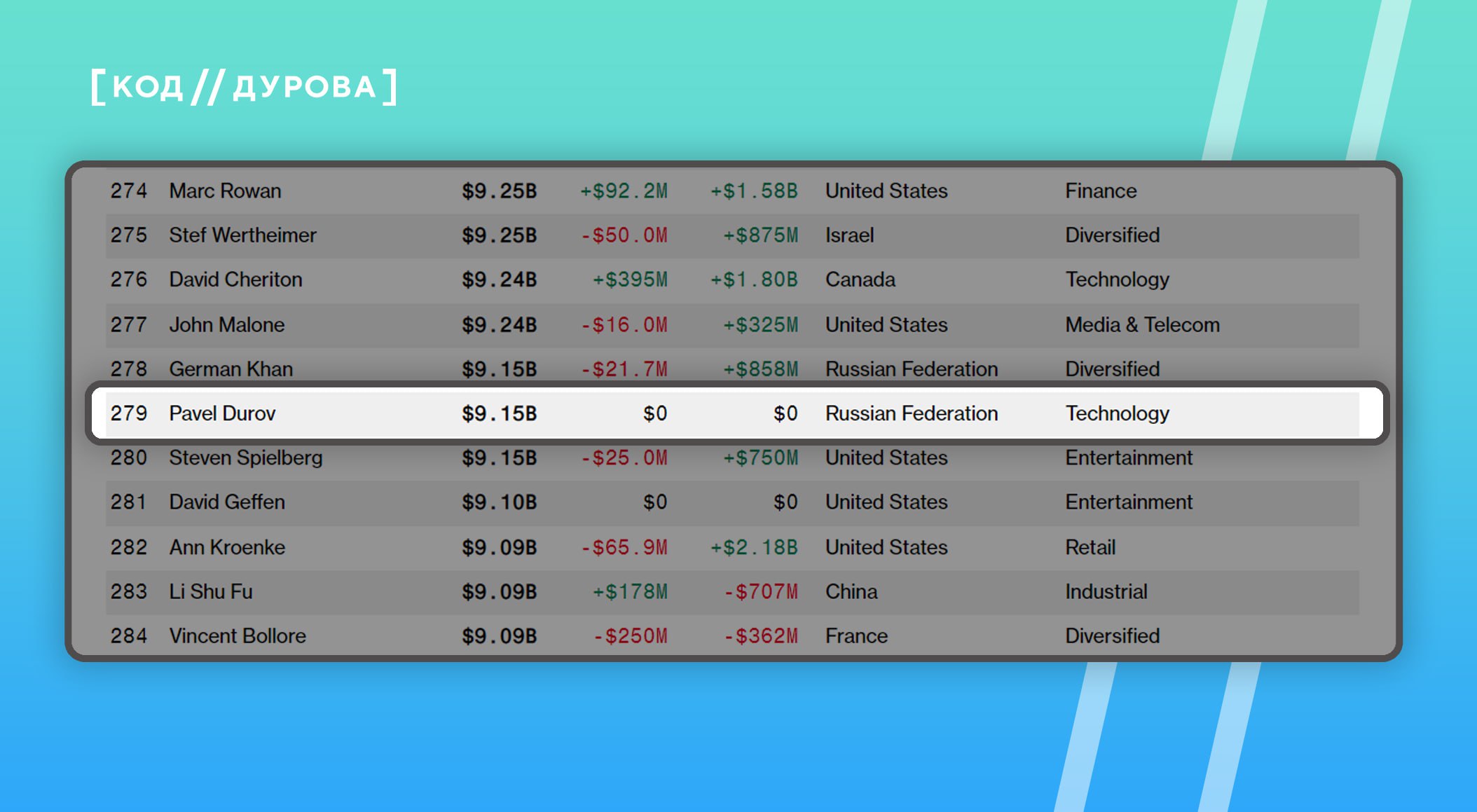 Π ΠΎΠ±Π½ΠΎΠ²Π»ΡΠ½Π½ΠΎΠΌ ΡΠ΅ΠΉΡΠΈΠ½Π³Π΅ Π±ΠΎΠ³Π°ΡΠ΅ΠΉΡΠΈΡ Π»ΡΠ΄Π΅ΠΉ Π³Π»Π°Π²Π° Telegram Π·Π°Π½ΡΠ» 279-Ρ ΡΡΡΠΎΡΠΊΡ. ΠΠ½ Π½Π°Ρ ΠΎΠ΄ΠΈΡΡΡ ΠΌΠ΅ΠΆΠ΄Ρ ΠΊΡΡΠΏΠ½ΡΠΌ Π°ΠΊΡΠΈΠΎΠ½Π΅ΡΠΎΠΌ Β«ΠΠ»ΡΡΠ°-ΠΡΡΠΏΠΏΒ» ΠΠ΅ΡΠΌΠ°Π½ΠΎΠΌ Π₯Π°Π½ΠΎΠΌ ΠΈ Π³ΠΎΠ»Π»ΠΈΠ²ΡΠ΄ΡΠΊΠΈΠΌ ΠΏΡΠΎΠ΄ΡΡΠ΅ΡΠΎΠΌ ΠΈ ΡΠ΅ΠΆΠΈΡΡΠ΅ΡΠΎΠΌ Π‘ΡΠΈΠ²Π΅Π½ΠΎΠΌ Π‘ΠΏΠΈΠ»Π±Π΅ΡΠ³ΠΎΠΌ.