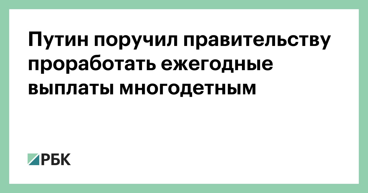 Президент России Владимир Путин поручил правительству рассмотреть вопрос об установлении ежегодной выплаты многодетным семьям ко Дню семьи, любви и верности (8 июля). Список поручений по итогам встречи главы государства с финалистами конкурса «Это у нас семейное», в котором участвуют команды из нескольких поколений семей, опубликован на сайте Кремля.