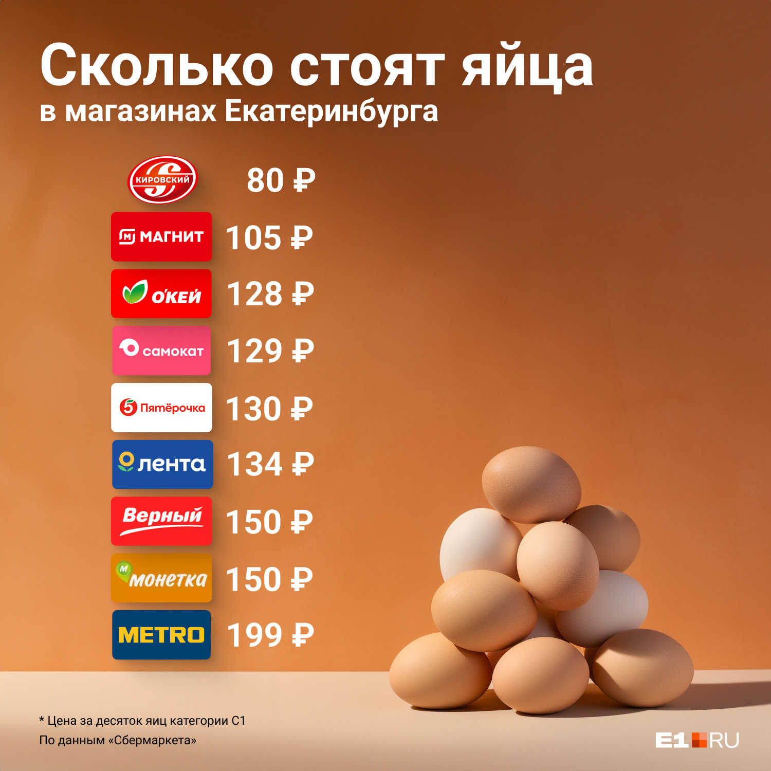 Ранее свердловский губернатор Евгений Куйвашев поручил крупным ритейлерам установить наценку на яйца не более 5%. Однако, глядя на цены в магазинах, трудно сказать, соблюдается ли эта договоренность. Кое-где стоимость яиц первой категории уже вплотную приблизилась к 200 рублям. Все рекорды бьет сеть Metro: по данным «Сбермаркета», там десяток деревенских яиц фирмы «Село зеленое» стоит 199 рублей.