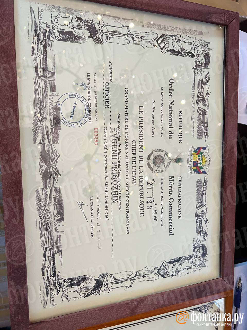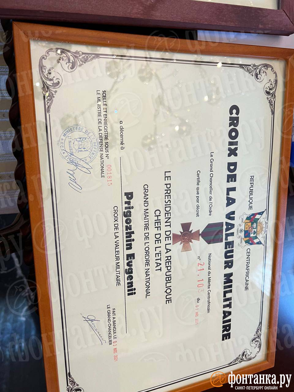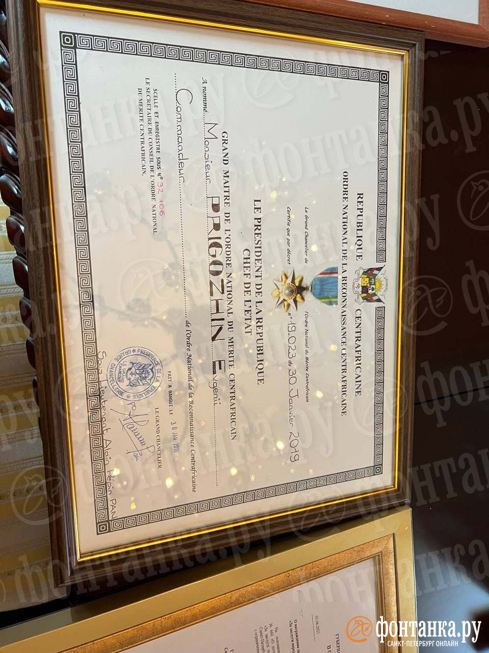 Нижний ряд состоит из иностранных наград. Из узнаваемых — крест «Воинской доблести» от Центральной африканской республики, был вручен Пригожину в марте 2021 года. И похоже, что центральноафриканская же звезда «За военные заслуги».