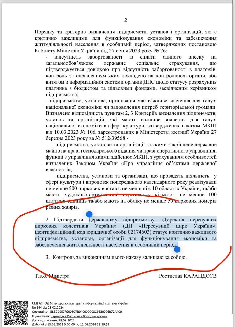 Минкульт признал "Передвижной цирк Украины" критически важным предприятием.