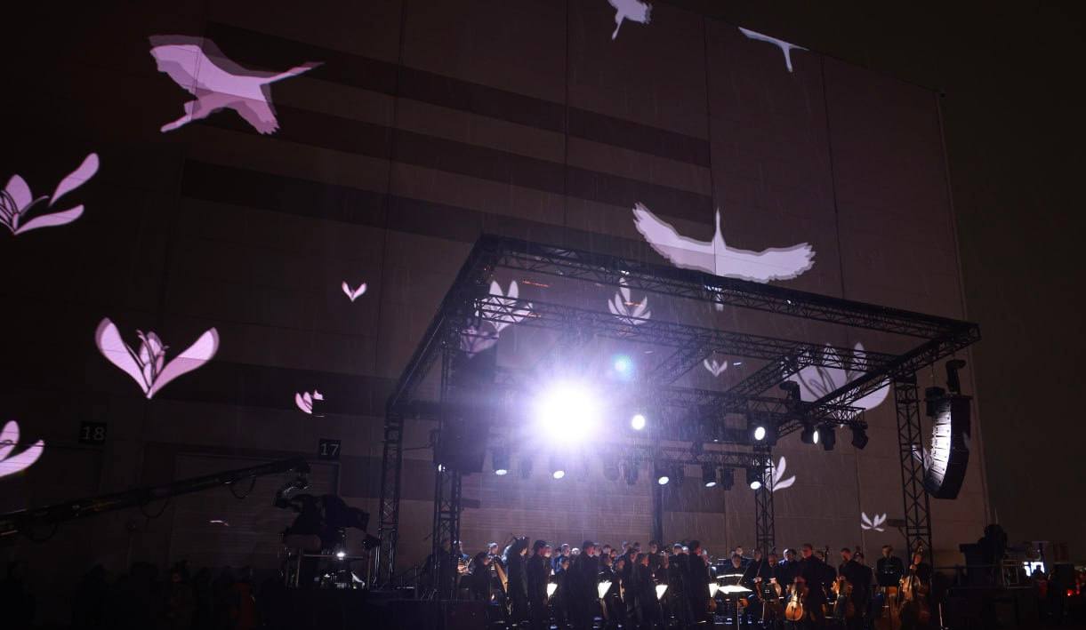В конце мероприятия была объявлена минута молчания под звуки колокола. В небо пустили яркий луч света.