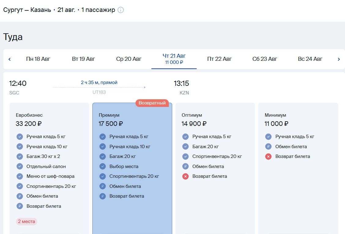 На данный момент доступен прямой рейс только в субботу — в 9:55. В другие дни улететь в Казань можно лишь с пересадкой — в Уфе или Тюмени.