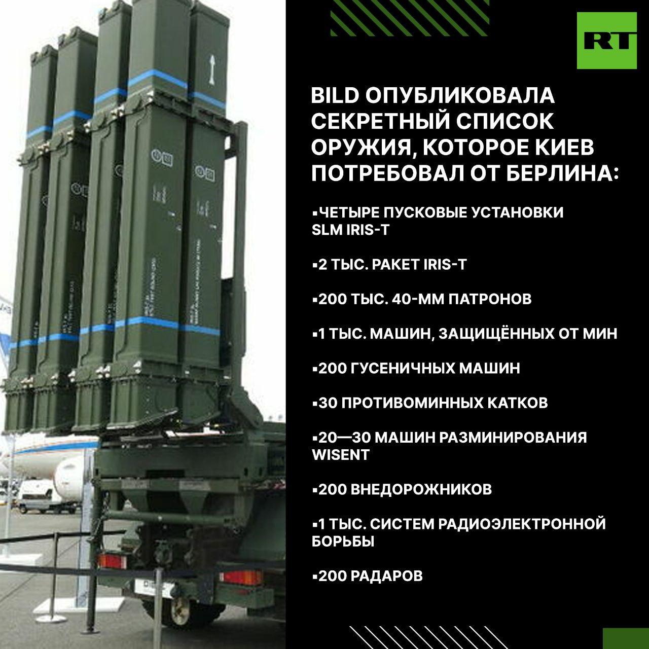 Украина передала Германии секретный список оружия, которое хочет получить, пишет Bild. В перечне в том числе зенитные комплексы IRIS-T с управляемыми ракетами и 200 тыс. боеприпасов для борьбы с дронами.
