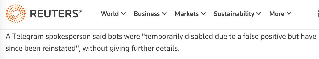 ⚡️Представитель Telegram заявил Reuters, что чат-боты украинских силовиков были "временно отключены из-за ложного срабатывания, но затем восстановлены”
