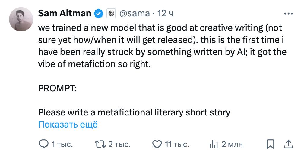 OpenAI создали модель, которая умеет писать книги. Сэм Альтман показал короткий рассказ про грустный ИИ, созданный нейросетью.