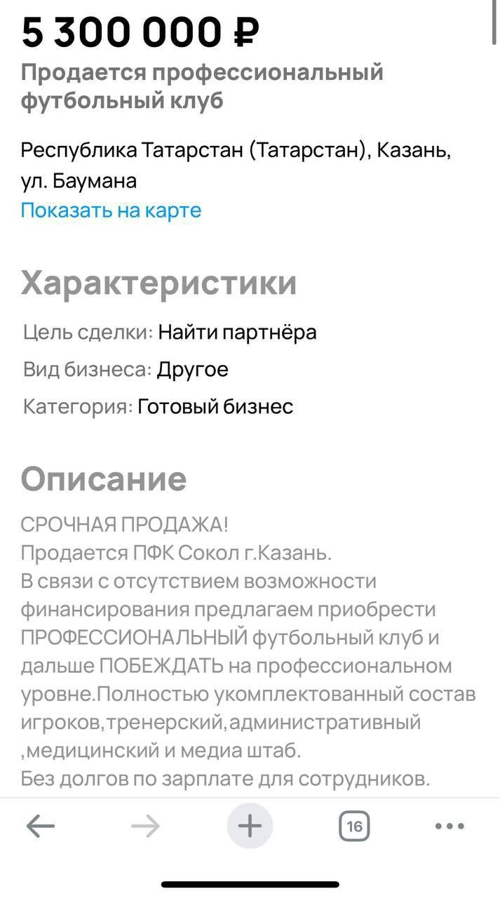 На Авито выставили на продажу казанский футбольный клуб «Сокол» за 5,3 млн рублей.