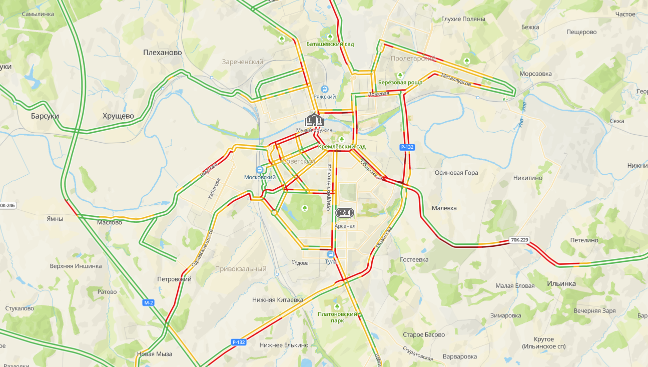 Вечером 1 декабря, в первый день зимы, город Тула оказался парализован серьезной пробкой, которая оценивается в 9 баллов по данным сервиса 2ГИС. Пробка затронула несколько участков дороги, включая проспект Ленина, от улицы Рязанской до пересечения с улицей Циолковского, а также от пересечения с улицей Первомайской до улицы Льва Толстого на пересечении с улицей Гоголевской.