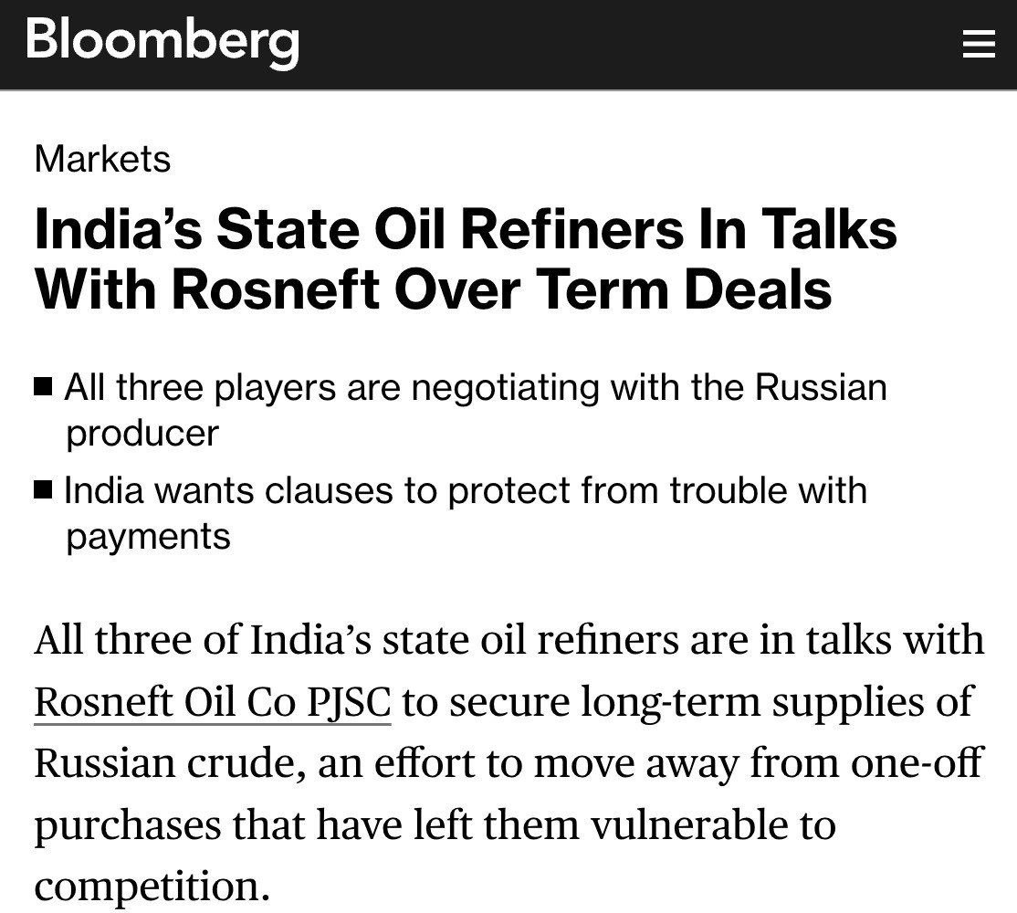 Все три государственных нефтеперерабатывающих завода Индии ведут переговоры с ПАО «НК «Роснефть» об обеспечении долгосрочных поставок российской нефти, пытаясь отойти от разовых закупок, которые сделали их уязвимыми для конкуренции. - Blommberg